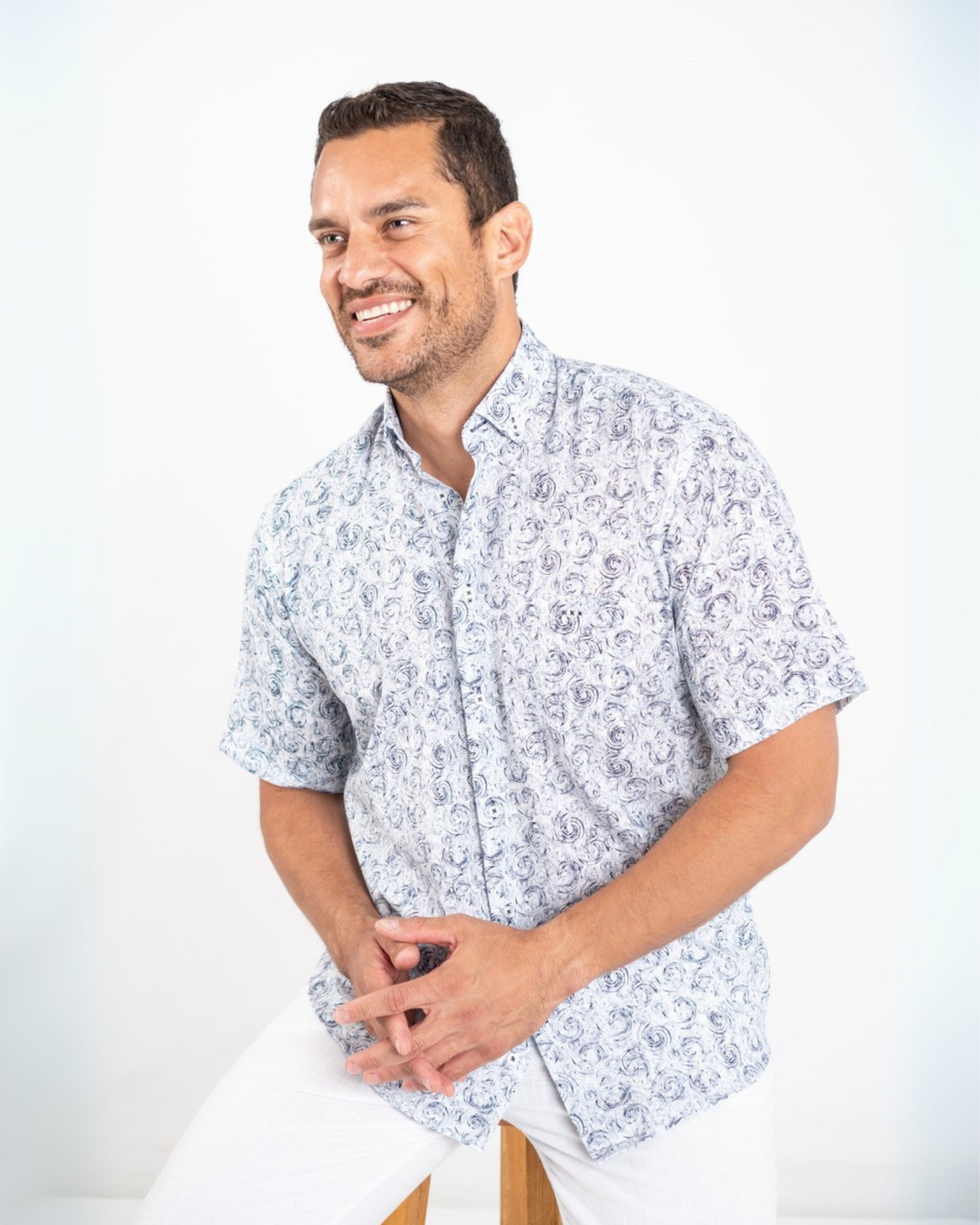 The Wave Shirt in Blue is your go-to essential. Featuring a classic Hawaiian silhouette updated with a bold navy wave print, it brings effortless style and comfort wherever the tide takes you.